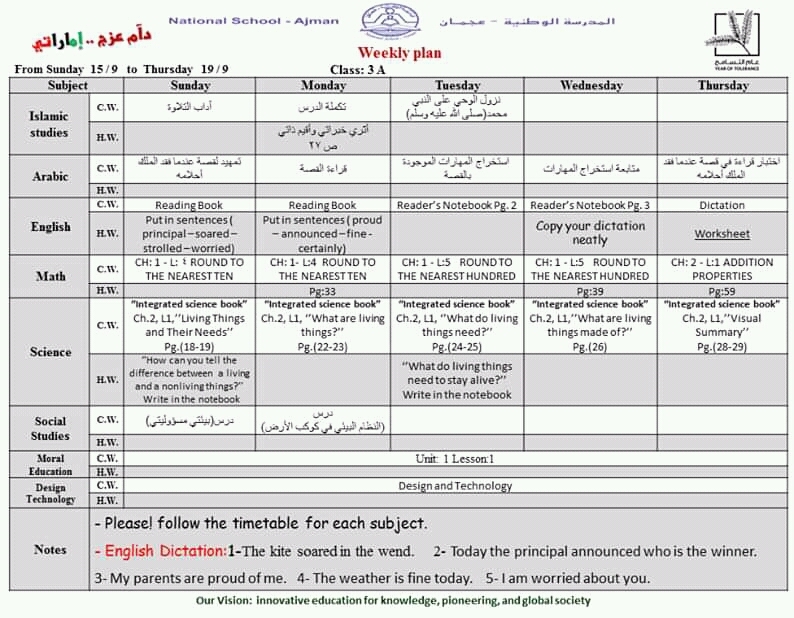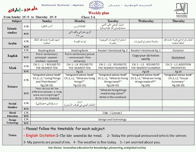 الخطة الأسبوعية للصف الثالث المدرسة الوطنية عجمان من 15-9 إلى 19-9-20219 الخطة الأسبوعية للصف الثالث من 15-9 إلى 19-9-20219 المدرسة الوطنية عجمان تحميل الملف اضغظ هنا