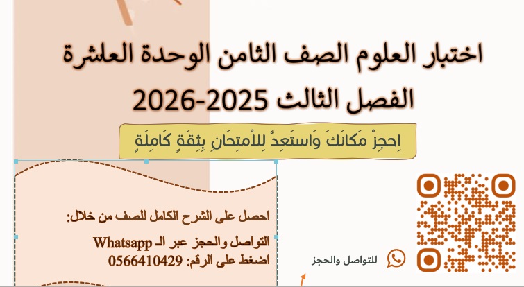 اختبار علوم الوحدة العاشرة الجيولوجيا والتأريخ غير محلول للصف الثامن من الفصل الدراسي الثالث للعام الدراسي 2025-2026 حيت يركز الاختبار علي عمليات التحجر (كالإحلال المعدني للأنسجة الميتة)، ومبادئ التأريخ النسبي (كسطح عدم التوافق، وترتيب الطبقات من الأقدم للأحدث)..