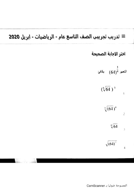 الاختبار التجريبي الاول رياضيات للصف التاسع الفصل الثالث 2019-2020